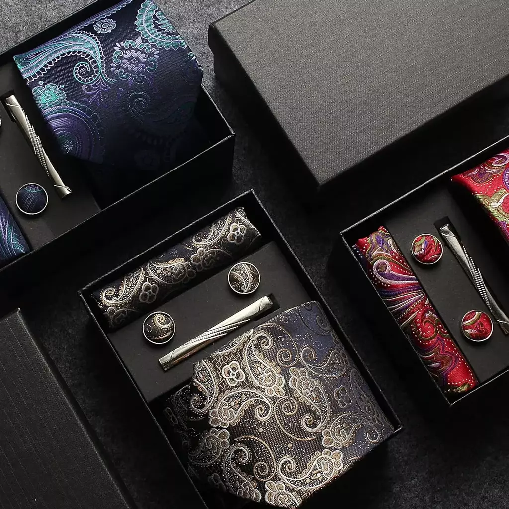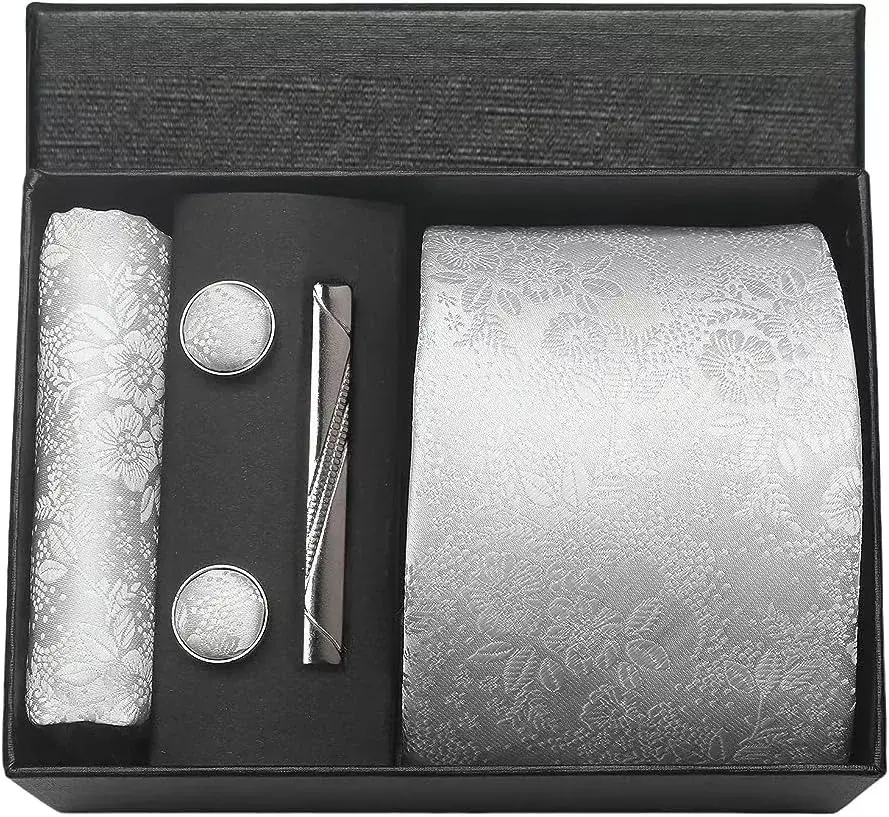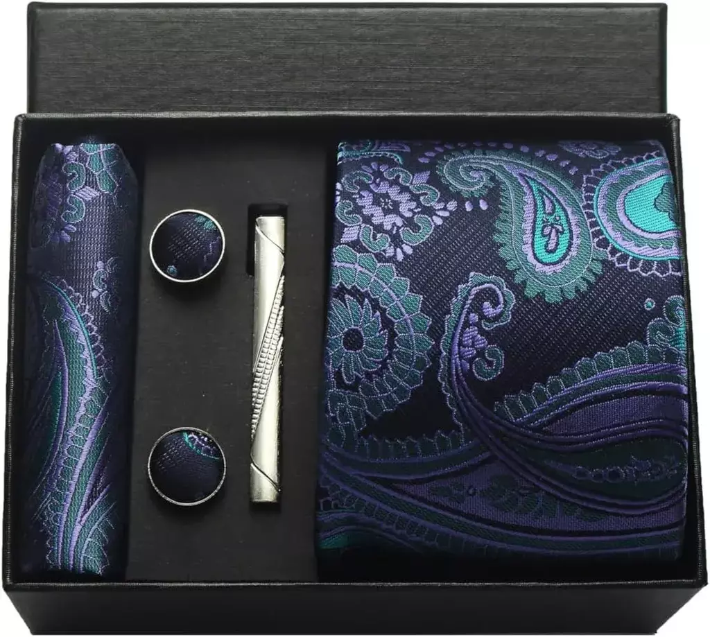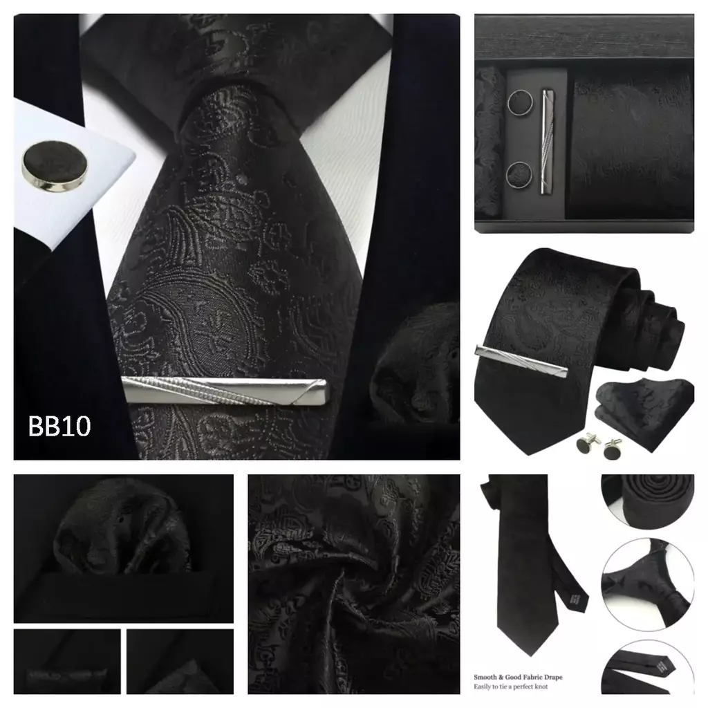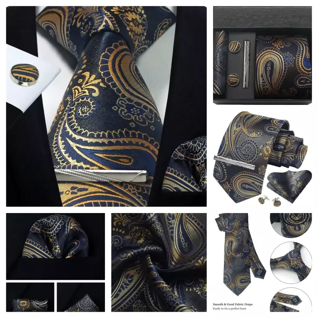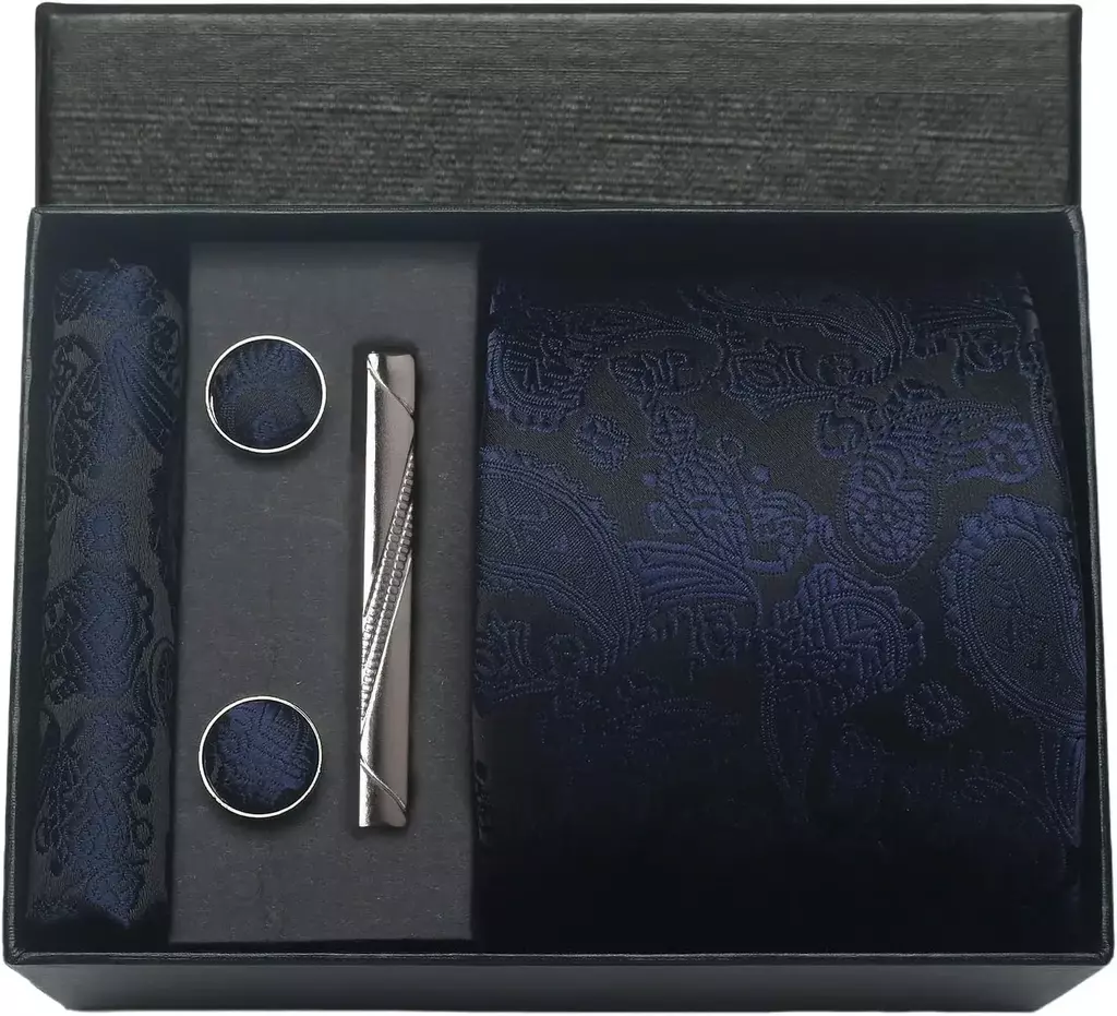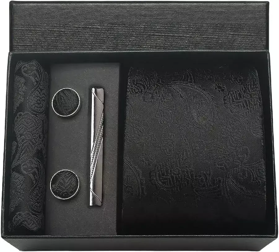 (inclui 1 gravata, 2 abotoaduras, 1 quadrado de bolso e 1 caixa de presente e 1 clipe de gravata)