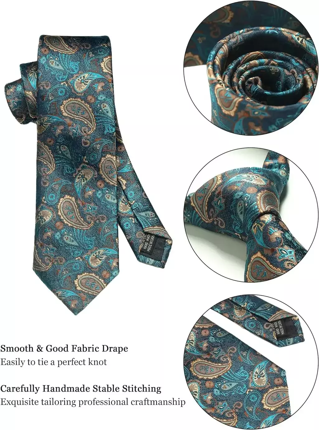 A costura e a linha do conjunto de gravata e bolso são lindas.confeccionada em tecido de microfibra, esta gravata masculina é lisa, macia e com bom caimento de tecido, rica em cores e lindo padrão paisley com forte efeito estereoscópico.bom material dá um nó de vento perfeito e uma recuperação mais fácil dos vincos.costura estável, material de alta qualidade tornam-no durável, conjunto perfeito de gravata, lenço, prendedores de gravata e abotoaduras.